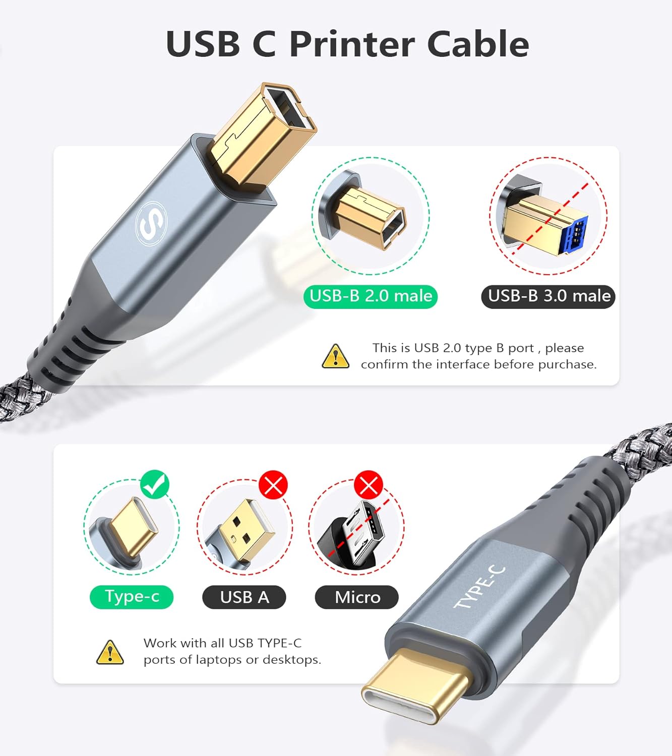 [ USB C Printer Cable ]: USB printer cable connects USB-C enabled devices (MacBook Pro, Surface Book 2, Chromebook Pixel, etc ) to USB 2.0 Type B devices and peripherals, USB 2.0 B male is Target side, compatible with USB Type B port(Legacy Printers, Multifunction, Laser or Thermal Printer, Desktop Document Scanner, Yamaha Casio Digital Piano, MIDI-Controller, Electric Keyboard, etc.)
